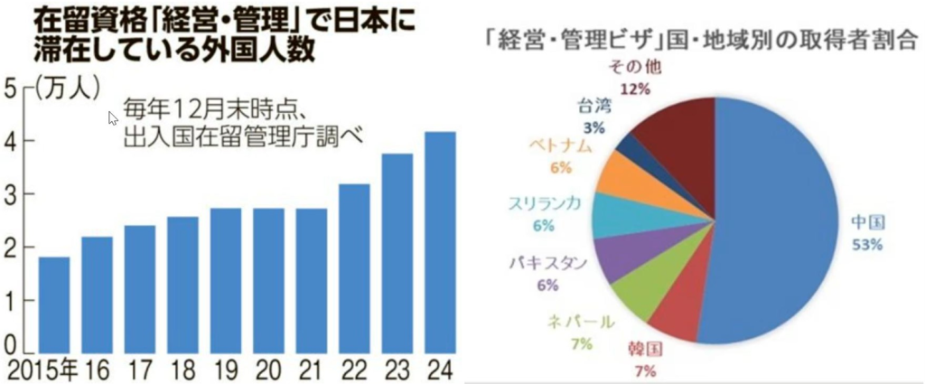 日本の出入国在留管理庁のデータによると、2024 年末時点で経営・管理ビザ保持者は約 41,615 人にのぼり、そのうち中国籍は約 21,740 人(全体の半数以上)を占めています。2015 年の約 7,000 人から 9 年間で 3 倍以上に増加しており、今回の政策変更が在日中国人経営者層に最も大きな影響を及ぼすとみられます。