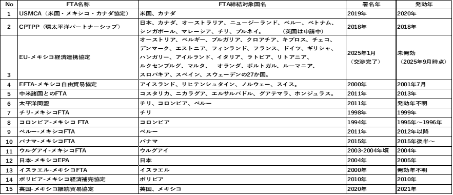 メキシコの積極的なリスク分散策としては、メキシコにとって自由貿易は生命線でありますから、アメリカとの貿易関係を維持した上で、現有している数多くの国々との交易を強化する事と、以下の表のFTA締結国を今後一層拡大することではないでしょうか?