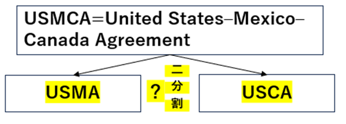 アメリカでは「United States–Mexico–Canada Agreement(USMCA)」ですが、カナダの英語では「Canada–United States–Mexico Agreement(CUSMA) 」と。カナダの仏語では「Accord Canada–États-Unis–Mexique (ACEUM)」。メキシコでは西語表記で「Tratado entre México, Estados Unidos y Canadá (T-MEC)」であります。本稿では日本で通用しているUSMCAを使用致します。