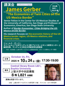 上智大学のイベロアメリカ研究所のセミナーが2025年10月24日に開催されました。米国とメキシコの国境地域の経済史、米国とメキシコの関係、金融危機を中心に研究しておられるカリフォルニア大学サンディエゴ校 アメリカーメキシコ研究センターの上級研究員でありますジェームズ・ガーバー(JamesGerber)名誉教授の講演を拝聴する機会を得ました。