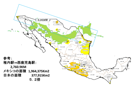 左の地図は、駐メキシコ日本大使館のHPから引用したものです。その上に日本列島の地図を重ねて比較しました。米国とメキシコの国境の長さは1,951マイル、つまり約3,141Kmとされており、稚内駅から西鹿児島駅までの鉄道距離の2,760.9Kmより長いです。