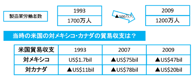昨年来、トランプ政権は「奪われた製造業を米国へ取り戻す」と強く主張し、米国内の投資を世界各国に求めています。一方、NAFTA発効後の2010年3月には下院議員ジーン・テイラーがH.R.4579という法案を提出しました。彼の主張は、NAFTAや同様の協定によって1993年と比較し米国の製造業が29%縮小したことを根拠に、NAFTAからの脱退を求めるものでした。この下院議員は民主党所属でしたが、その問題意識はトランプ大統領の主張と同根と言えます。