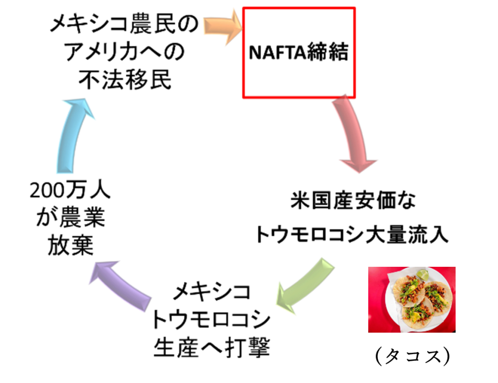 左図 (SmartArtグラフィックの循環図) は、NAFTAがメキシコ農民を米国の不法移民へと追いやった時系列の動きを示すものと理解しています。米国の大規模農業による安価なトウモロコシがメキシコに流入し、タコスの皮であるトルティージャの原料として利用されていた地元農家のトウモロコシを駆逐しました。その結果、メキシコの栽培農家は崩壊し、多くの農民が生活の糧を失ったと説明されています。