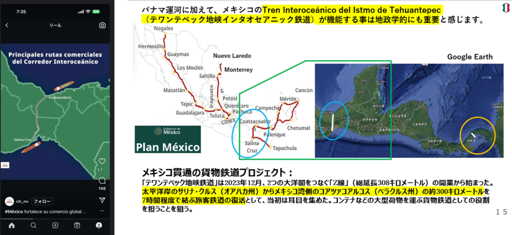 メキシコ政府の「PLAN MEXICO」に含まれていますが、私はパナマ運河ではなく、太平洋と大西洋を結ぶテワンテペック地峡鉄道に期待したいと考えています。太平洋とメキシコ湾をつなぐメキシコの大洋間鉄道が、港湾整備も含めて集中的な開発に名乗りを上げています。過日、事故があったことは残念ですが、現在は改良工事が進められており、安全面にも配慮しながら、地政学的プロジェクトとして成長していくことを祈念しております。日本企業の参加にも期待したいところです。